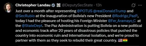 “El gobierno de Paz está reorientando a Bolivia política y económicamente tras 20 años de políticas desastrosas que llevaron al país a la ruina económica y al aislamiento internacional, y nos enorgullece colaborar con ellos en su esfuerzo por reconstruir su gran país”, expresó la autoridad estadounidense en sus redes sociales.