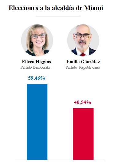 Higgins, de 61 años y ex comisionada del condado, derrotó en la segunda vuelta electoral con el 59% de los votos al gerente municipal Emilio González, que recibió un 41%. El 4 de noviembre, la primera vuelta, Higgins se había impuesto con el 35% de los votos frente al 19% de González.