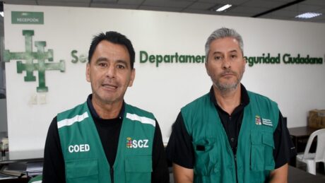 Carlos Hurtado y Jhonny Castedo, coordinadores del COED, solicitan donaciones de la población cruceña para apoyar a las familias damnificadas por la riada en el municipio del Torno.