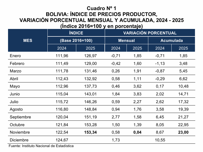 En noviembre de la presente gestión, el Índice de Precios Productor (IPP) registró un incremento de 0,04% con relación al mes de octubre y la variación acumulada a noviembre fue de 23,00%, informó el Instituto Nacional de Estadística (INE).