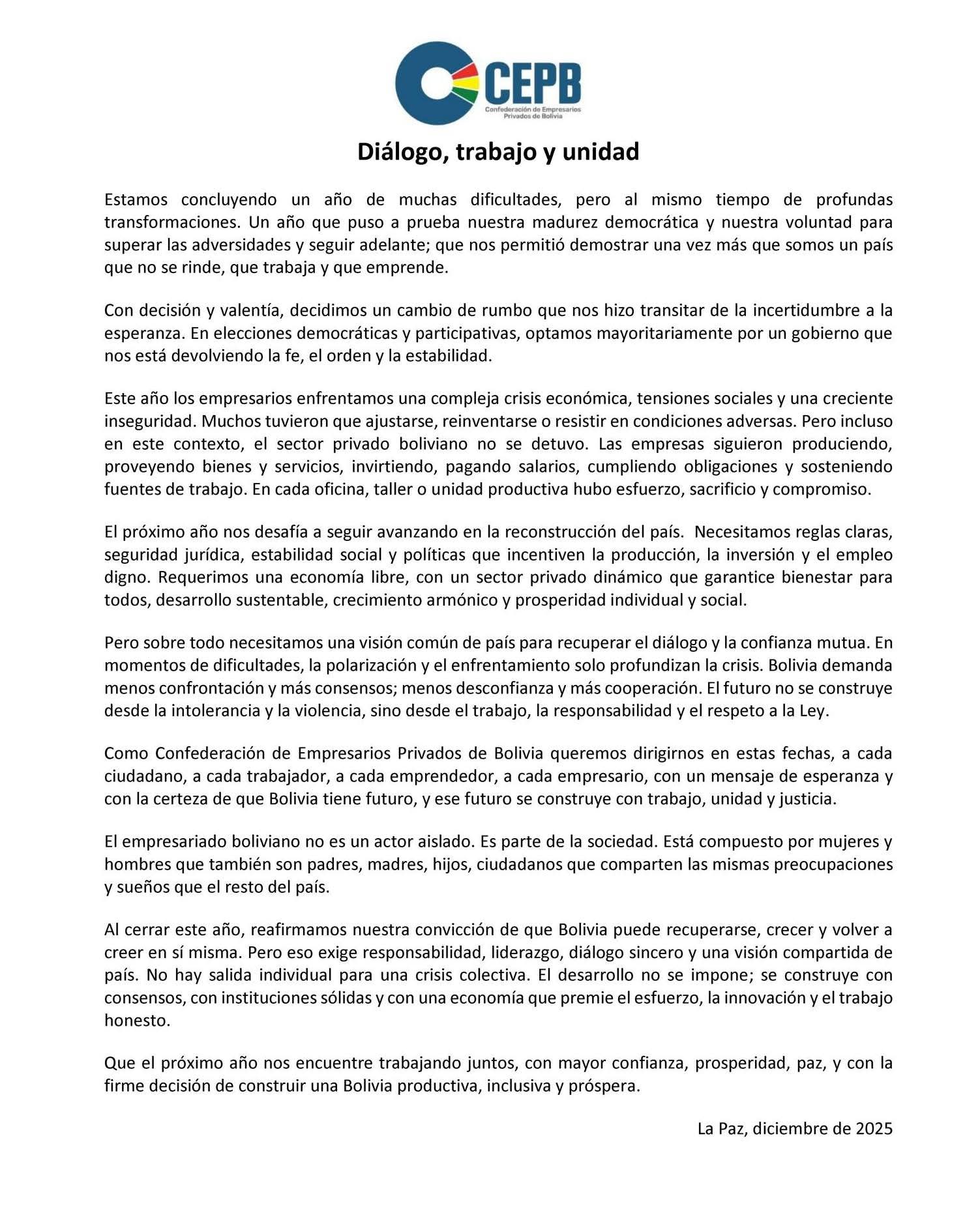 Al dirigirse a la población, la CEPB afirmó que “Bolivia tiene futuro, y ese futuro se construye con trabajo, unidad y justicia”.