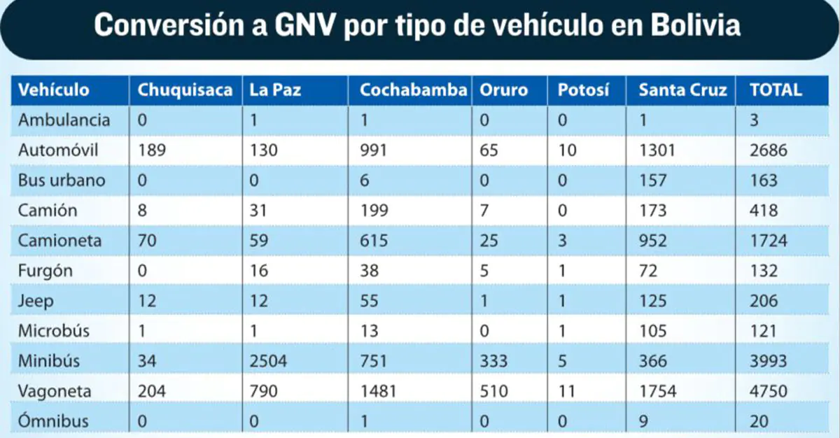 Entretanto, el INE remitió en un boletín estadístico que, en 2024 los vehículos convertidos a GNV llegaban a 14.216 de los 2.583.283 de motorizados que conforman el parque automotor (cifras hasta la gestión 2024).