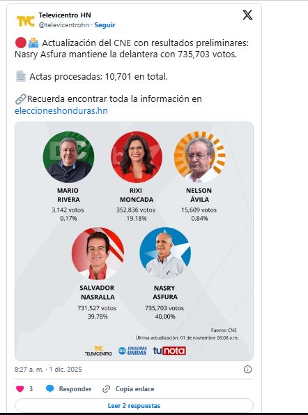 El resultado provisional apunta a que Asfura lidera la contienda al obtener 735.703 sufragios que representan el 40 %; en tanto que Nasralla, del Partido Liberal, cuenta con 731.527 (39,78 %).