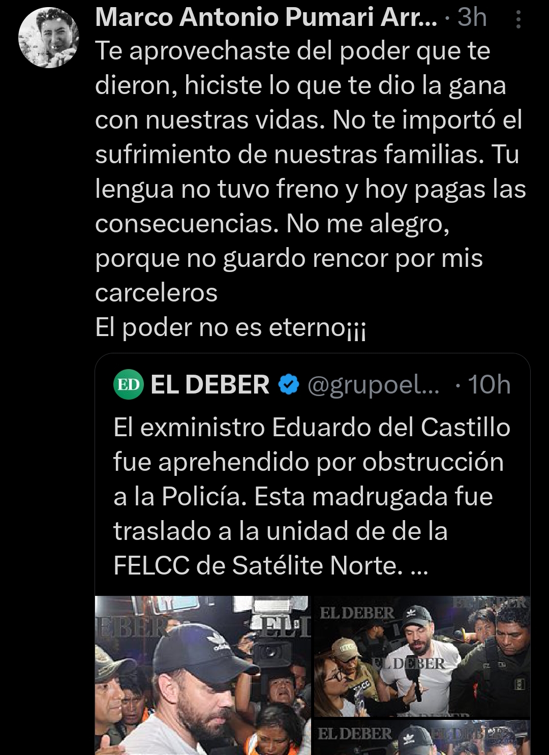“El poder no es eterno”, afirmó este martes el excívico Marco Pumari al enterarse del arresto del exministro de Gobierno, Eduardo del Castillo, cuando pretendía emprender un viaje al exterior desde el aeropuerto internacional de Viru Viru, en el departamento de Santa Cruz.