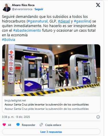 “Seguiré demandando que los subsidios a todos los hidrocarburos (gas natural, GLP, diésel y gasolina) se quiten inmediatamente. No hacerlo es ser irresponsable con el abastecimiento futuro y ocasionar un caos total en la economía”, sostuvo Ríos en sus redes sociales.