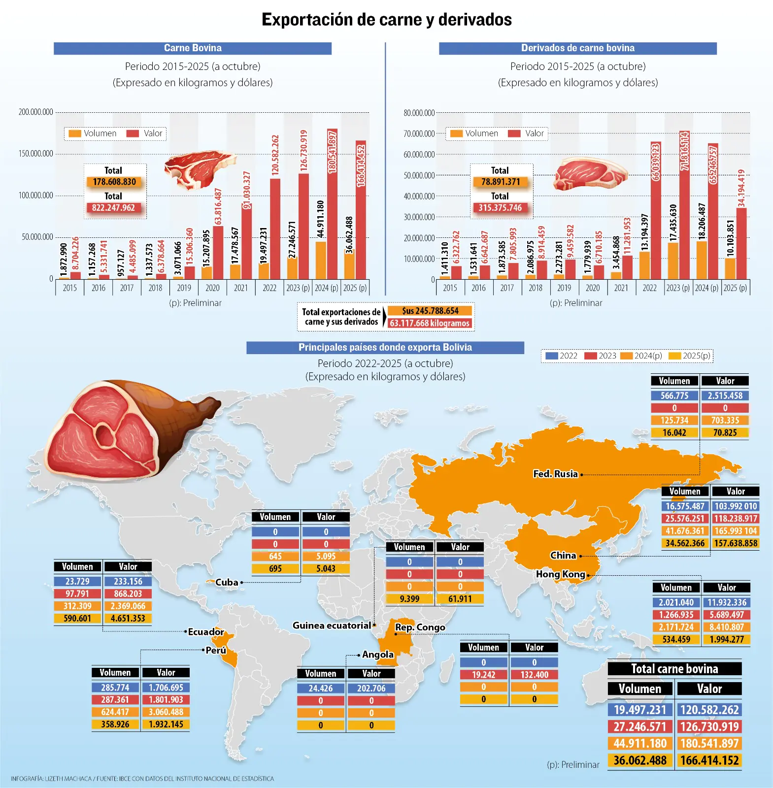 Según el informe compartido con La Razón, en 2024 el país logró un récord de exportación de carne bovina por $us 180 millones y casi 45.000 toneladas; mientras que los derivados de carne sumaron $us 65 millones. Rodríguez resaltó un trabajo sanitario importante (libre de fiebre aftosa) y una marca país que empieza a construirse: “Bolivian Natural Beef”.