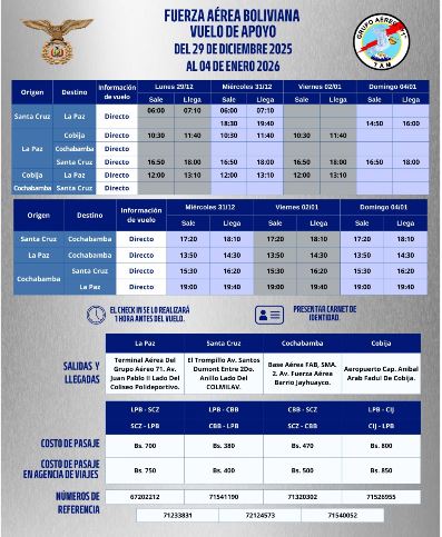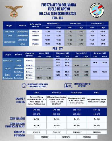 Con el objetivo de facilitar el traslado de pasajeros durante las fiestas de fin de año y el feriado largo, se han establecido los siguientes precios oficiales para los vuelos de apoyo operados por la Fuerza Aérea Boliviana (FAB):