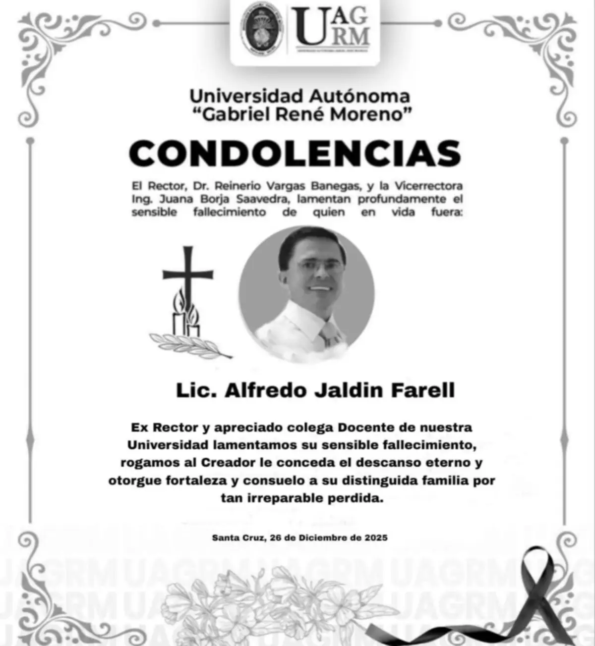 El exrector de la Universidad Autónoma Gabriel René Moreno, Alfredo Jaldín Farell, falleció la noche de este viernes 26 de diciembre tras atravesar problemas de salud. Autoridades, docentes y la comunidad universitaria lamentan su partida y destacan su legado académico.