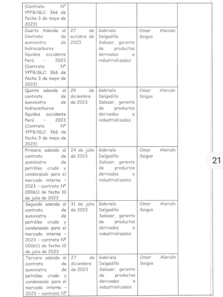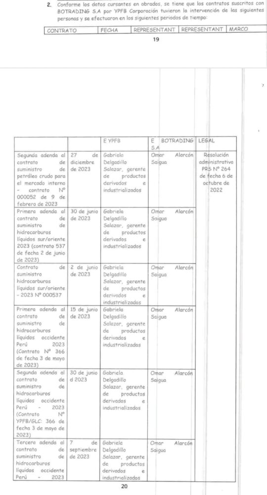 “Al suscribir los contratos de compra de combustible o materias primas en representación de YPFB y BOTRADING S.A., respectivamente, pese a que estos implicaban una mayor erogación de recursos económicos a la verdaderamente necesaria para la compra de estos productos, en perjuicio del erario nacional, (en el caso de los codenunciados Gabriela Delgadilla Salazar, Omar Alarcón Saigua y Luis Rolando Ayala Sánchez) y a sabiendas de la incompatibilidad que implicaba este acto, ya que los representantes legales de BOTRADING S.A fueron funcionarios de YPFB y sus subsidiarias al momento de la suscripción de los contratos, incurriendo en las exclusiones contempladas por el mismo reglamento interno de contrataciones de YPFB, que era de pleno conocimiento de los tres denunciados (Gabriela Delgadilla Salazar, Omar Alarcón Saigua y Luis Rolando Ayala Sánchez)”, señala el documento.