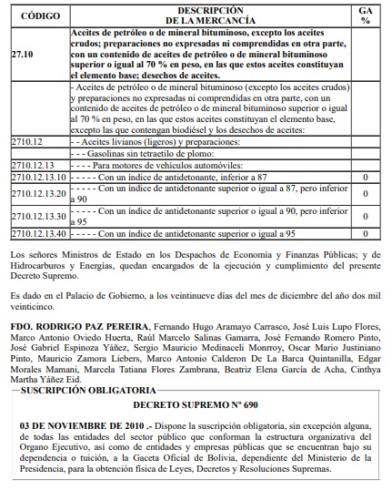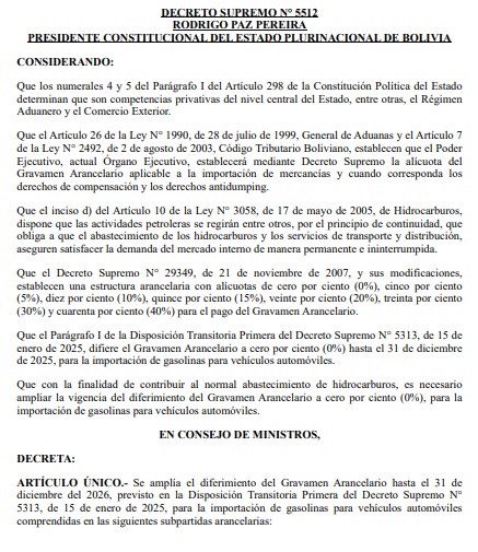 “Se amplía el diferimiento del Gravamen Arancelario hasta el 31 de diciembre del 2026, previsto en la Disposición Transitoria Primera del Decreto Supremo N° 5313, de 15 de enero de 2025, para la importación de gasolinas para vehículos automóviles”, refiere la norma.