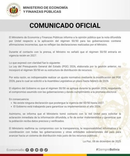 «La Ley del PGE 2026 elaborada por la anterior gestión, no incorporó el régimen 50/50. Por ello es necesario realizar un ajuste normativo y solicitar a la Asamblea Legislativa un plazo hasta febrero de 2026 para modificar el PGE. Nuestro objetivo es que el régimen 50/50 se aplique durante la gestión 2026, tal como fue comprometido con las gobernaciones», afirmó el Ministro.