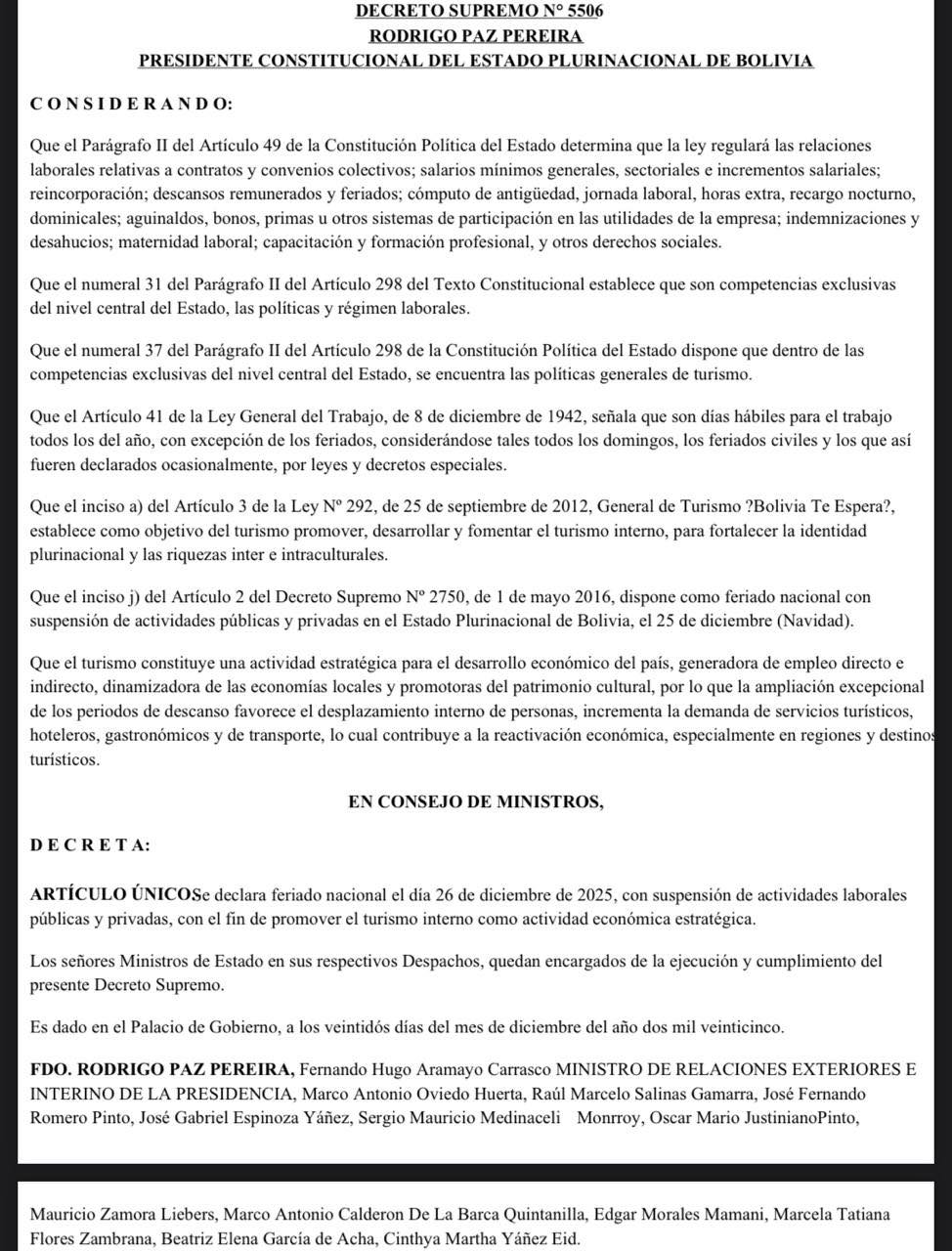 «Se declara feriado nacional el día 26 de diciembre de 2025, con suspensión de actividades laborales públicas y privadas, con el fin de promover el turismo interno como actividad económica estratégica», detalla el Decreto Supremo 5506.