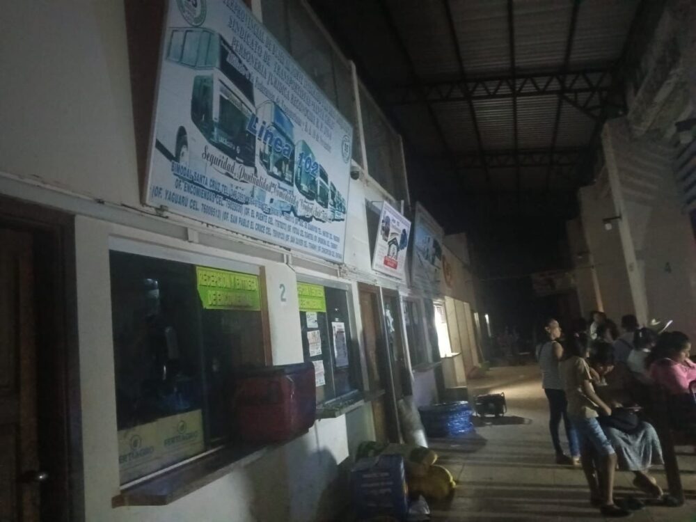 A raíz del desperfecto de un transformador, la nueva terminal de buses de esta capital provincial, está sin energía eléctrica. Las empresas de transporte recurren a pequeñas lámparas o pequeños generadores para poder operar en el horario nocturno y atender a los pasajeros.