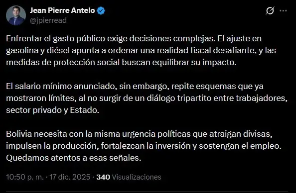 El presidente de la Cámara de Industria, Comercio, Servicios y Turismo de Santa Cruz (Cainco), Jean Pierre Antelo, afirmó que el reciente ajuste en los precios de la gasolina y el diésel responde a la necesidad de ordenar una situación fiscal compleja en Bolivia, aunque advirtió que el incremento del salario mínimo vuelve a repetir esquemas agotados.