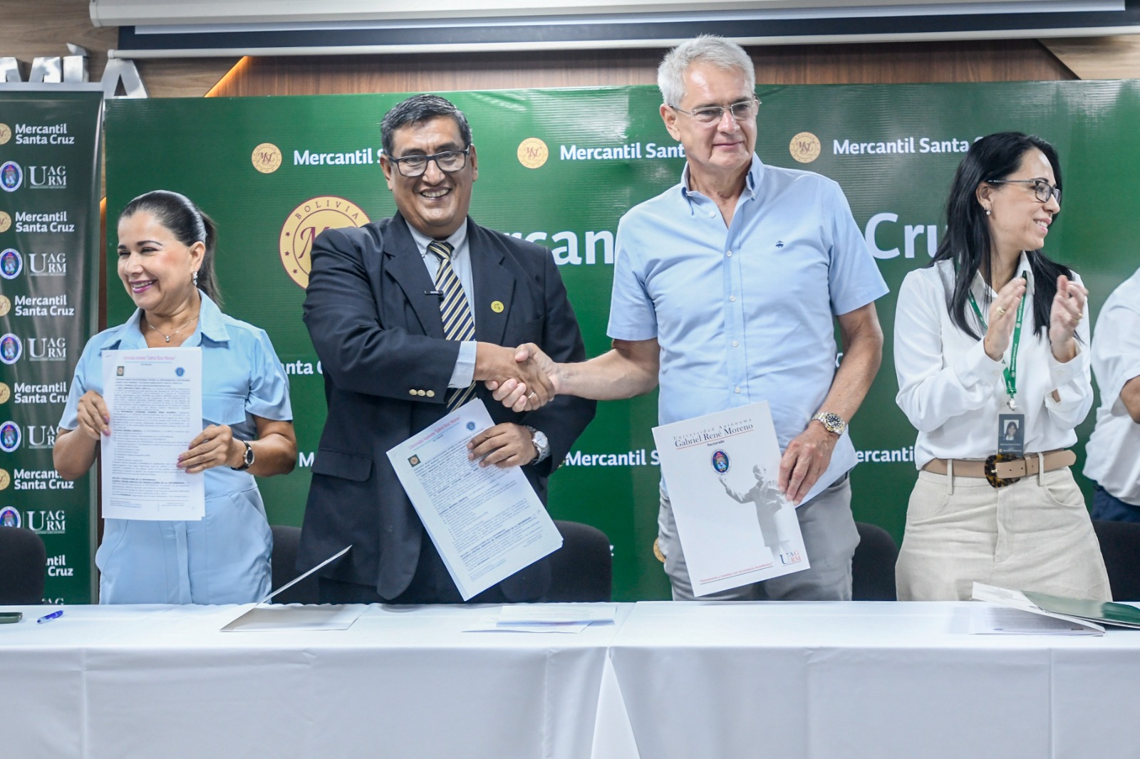 La Universidad Autónoma Gabriel René Moreno (UAGRM), la más grande del país, y el Banco Mercantil Santa Cruz, la entidad financiera privada más grande de Bolivia, anunciaron hoy una alianza estratégica integral. El acuerdo tiene como objetivo principal optimizar la gestión administrativa y financiera de la universidad mediante soluciones financieras con tecnología de vanguardia, al tiempo que despliega un amplio programa de beneficios y oportunidades para toda su comunidad universitaria.