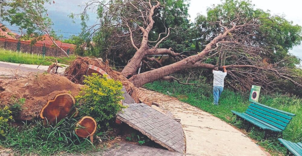 “Esto es un peligro”, denuncia un padre de familia que llegó hasta el parque cerrado Las Gemas, en el Distrito 5, donde incluso un enorme árbol de cupesí cayó y levantó el piso con sus raíces. “Está así hace meses”, agrega.