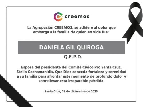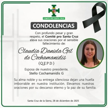 Claudia Daniela Gil Quiroga, esposa del presidente del Comité Pro Santa Cruz, Stello Cochamanidis, falleció, informó este domingo por la noche la institución cívica mediante un comunicado oficial.