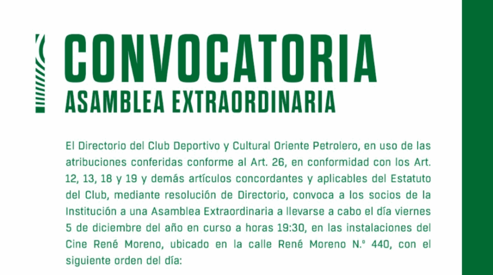 Oriente Petrolero informó este lunes que convoca a una Asamblea Extraordinaria para el próximo viernes 5 de diciembre, a partir de las 19:30, en el Cine René Moreno. La convocatoria fue emitida por el Directorio del club. Además, la institución remarcó que se rige estrictamente por las normas que regulan el fútbol boliviano, con el fin de evitar vicios de nulidad y posibles cuestionamientos a futuro.