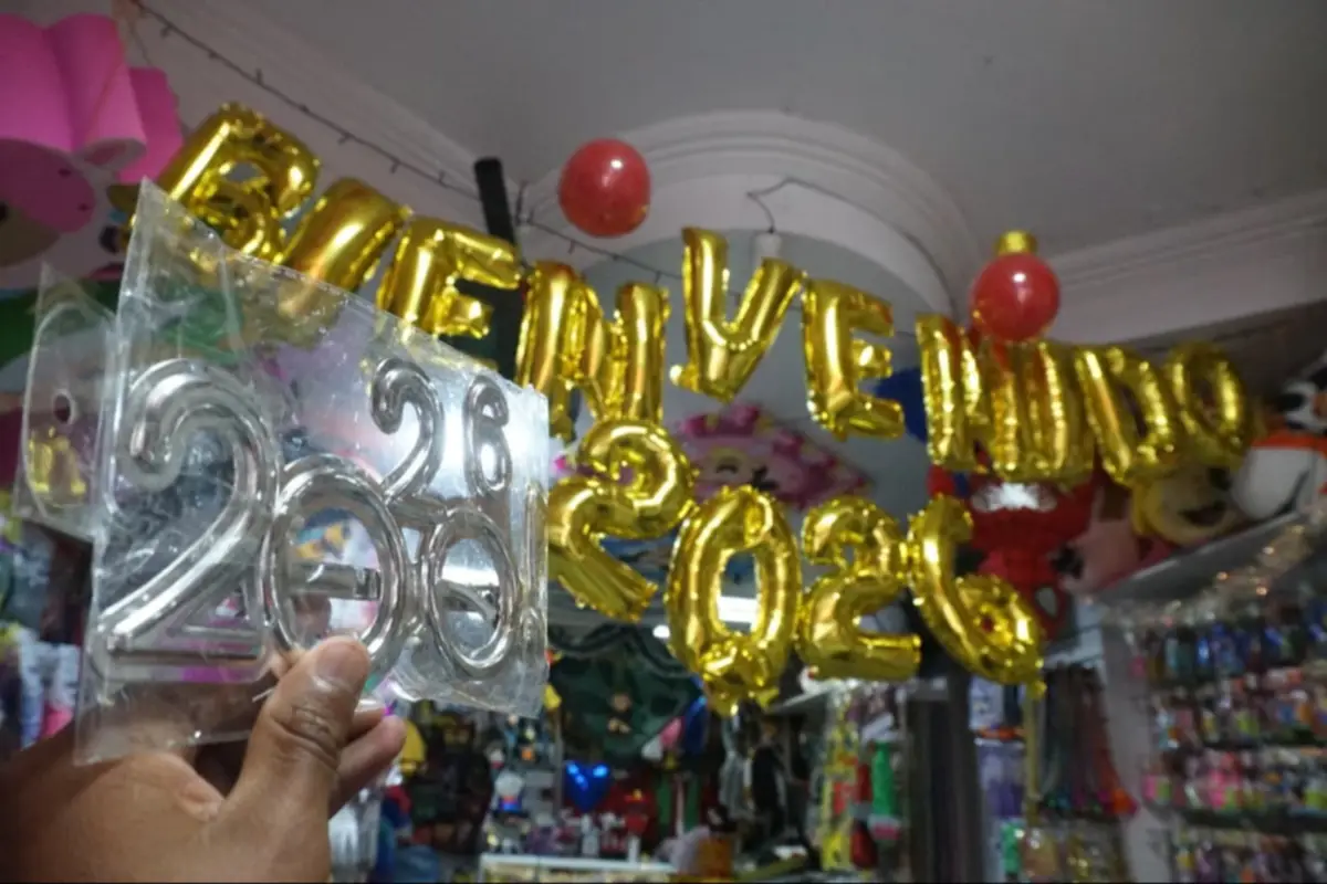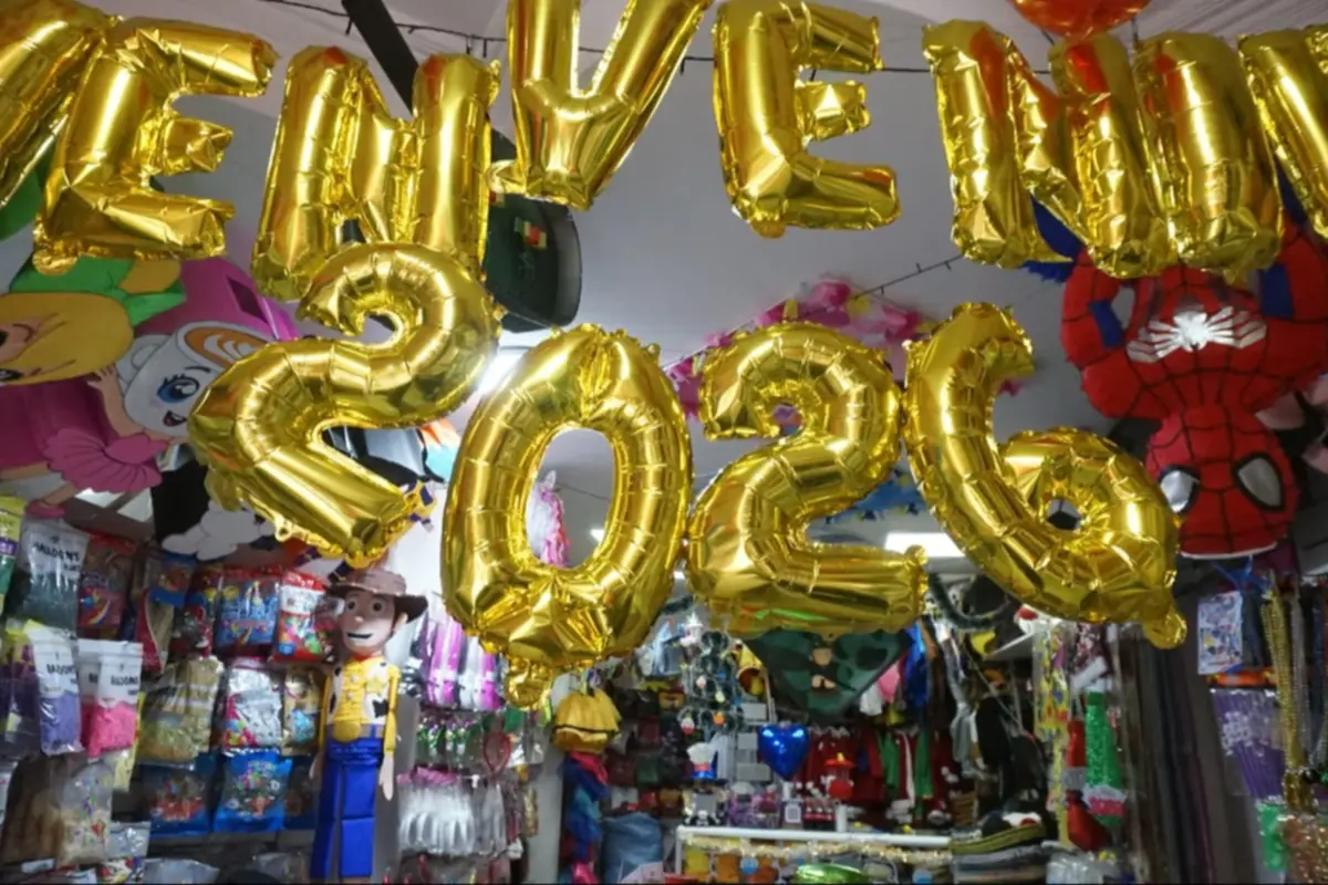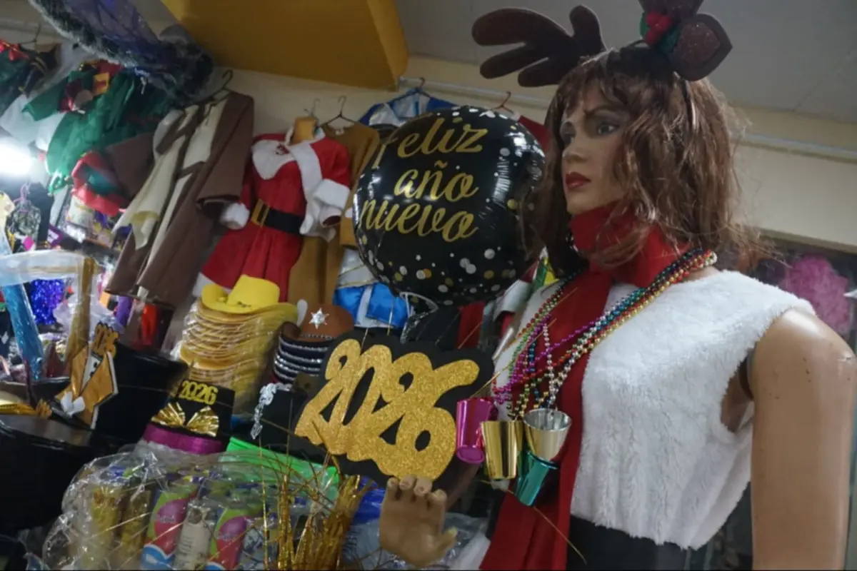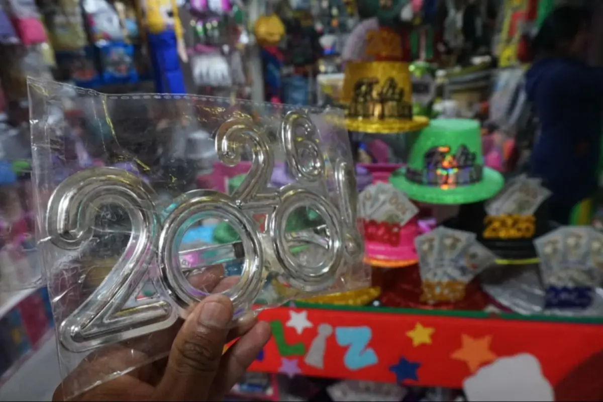 Cotillón y cábalas: Los puestos de venta se han teñido de dorado y plateado. Sombreros, lentes y accesorios con el número «2026» son los favoritos de los jóvenes.