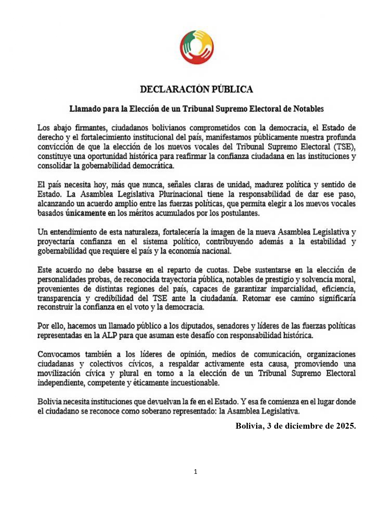 Y, ante un país que reclama transparencia y certidumbre, el colectivo de personalidades pide que los nuevos vocales electorales no sean fruto de un acuerdo político, sino el resultado de un examen riguroso de méritos, integridad y servicio público. “Bolivia necesita de instituciones que devuelvan la fe en el Estado. Y esa fe comienza en el lugar donde el ciudadano se reconoce como soberano representado: la Asamblea Legislativa”, sentencia.