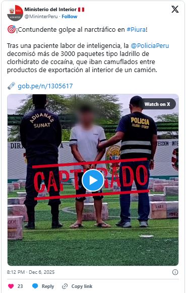 El operativo ocurrió el miércoles, cuando agentes policiales interceptaron un camión con más de 3.000 paquetes «tipo ladrillo» de cocaína. El vehículo se dirigía a un almacén donde se acondicionaban cajas de bananos orgánicos para exportación, a unos 100 kilómetros del puerto de Paita en Piura.