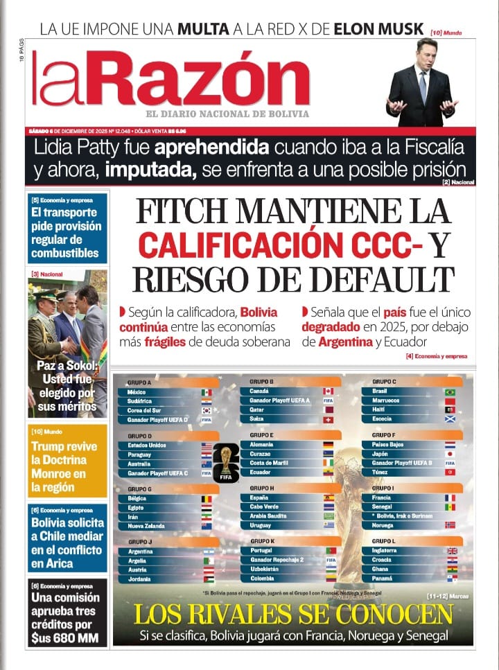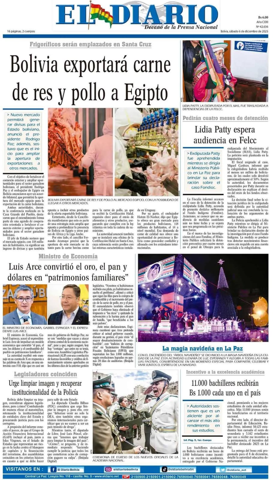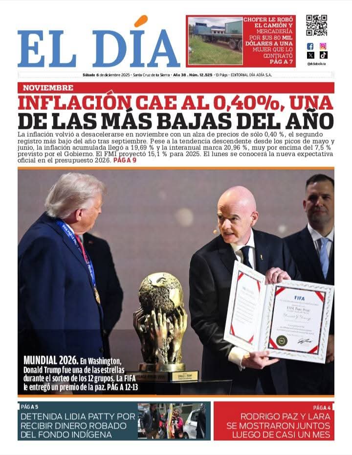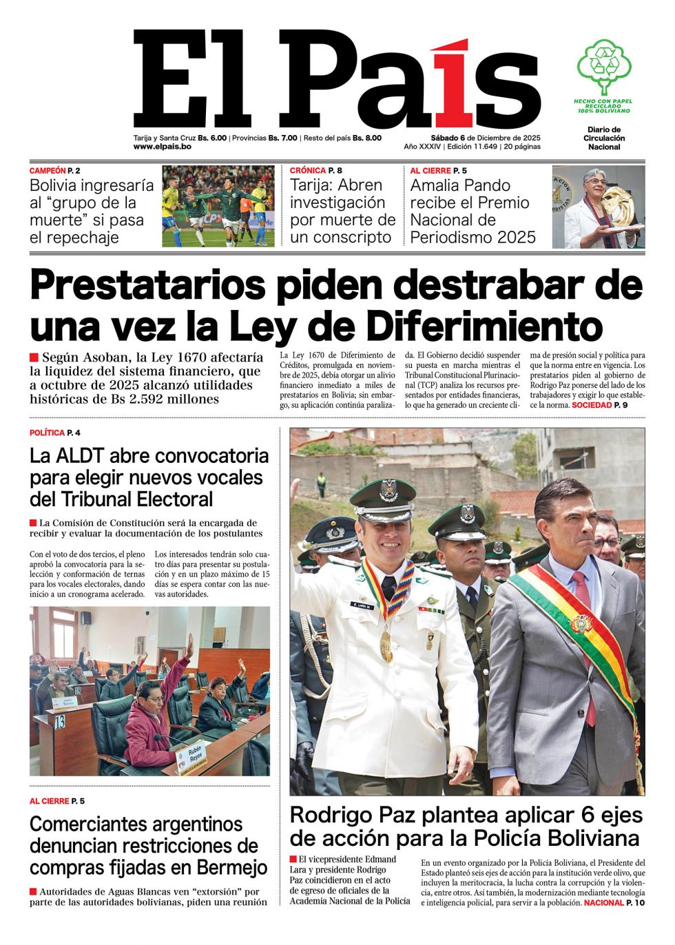 Portadas de los periódicos de Bolivia del sábado 6 de diciembre del 2025