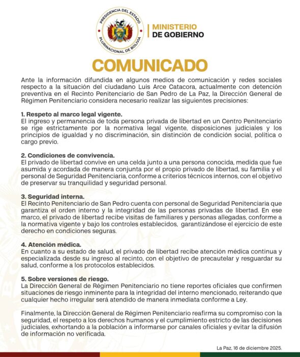 Respecto a las condiciones de alojamiento, el comunicado aclara en su segundo punto que «el privado de libertad convive en una celda junto a una persona conocida». Esta medida, según la autoridad, fue «asumida y acordada de manera conjunta» por el propio Arce, su familia y el personal de seguridad, con el fin declarado de preservar su «tranquilidad y seguridad personal». Esto contradice la versión del abogado sobre la falta de una celda.