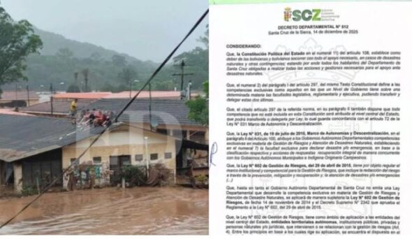 «En fecha 05 de noviembre de 2025, el Gobernador del Departamento de manera conjunta con su Gabinete emiten el Decreto Departamental N° 510, que DECLARA EMERGENCIA DEPARTAMENTAL, debido a las variaciones climáticas registradas, que han y están ocasionando tormentas eléctricas, lluvias intensas, crecidas de ríos, desborde de ríos, desvío de cauces, ante un inminente riesgo de inundación en las cuencas principales, que ponen en riesgo, la vida e integridad de las personas, salud, biodiversidad, seguridad alimentaria y económica en el Departamento de Santa Cruz», indica el nuevo el Decreto Departamental N° 512.
