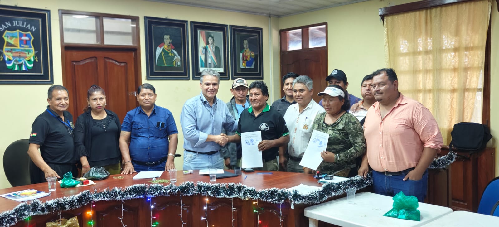 El acuerdo fue suscrito a primera hora de la tarde del 24 de diciembre en el municipio cruceño de San Julián entre el viceministro de Defensa Social y Sustancias Controladas, Ernesto Justiniano, el alcalde municipal Willy Calderón Coca y representantes de organizaciones sociales, productivas y del transporte, en el marco de una reunión destinada a restablecer el libre tránsito y la normalidad económica en la región.