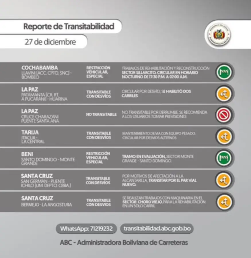 La Administradora Boliviana de Carreteras (ABC) difundió este sábado 27 de diciembre su reporte actualizado de transitabilidad, en el que detalla el estado de varios tramos de la Red Vial Fundamental, advirtiendo sobre restricciones vehiculares, desvíos y trabajos de rehabilitación en distintos departamentos del país.