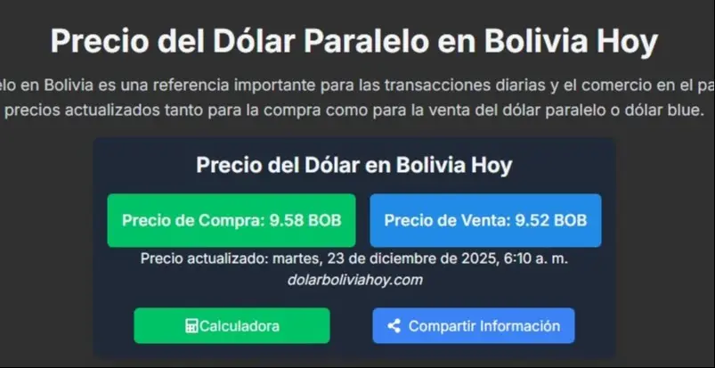 Según datos emitidos este martes 23 de diciembre de 2025 por el portal especializado dolarboliviahoy.com, la divisa estadounidense se cotiza en el mercado paralelo con un precio a la venta de 9.62 BOB y un precio de compra de 9.71 BOB.