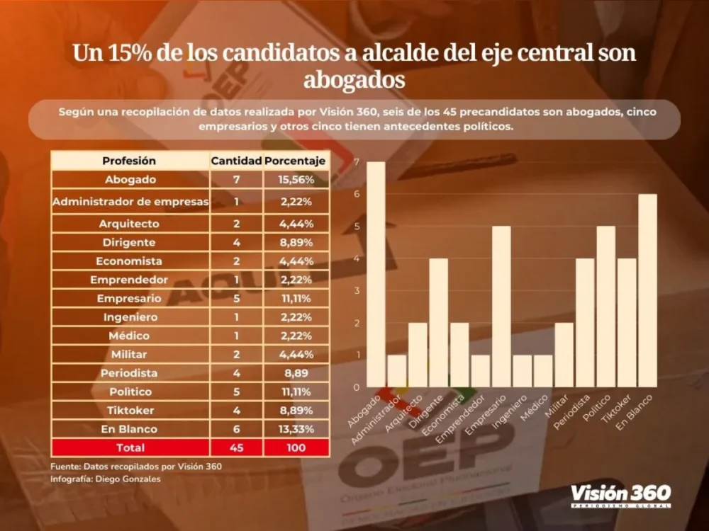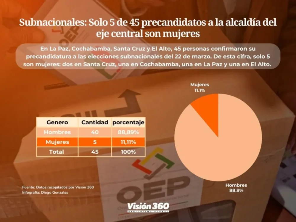 Las ciudades del eje central, La Paz, Cochabamba, Santa Cruz y El Alto suman 45 precandidatos confirmados para las alcaldías, rumbo a las elecciones subnacionales. De esta cifra, sólo cinco son mujeres (11,1%). Además, la mayoría de los postulantes tiene perfil estudios en la carrera de derecho.
