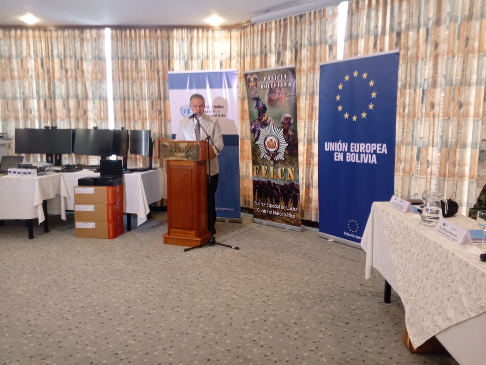 La entrega efectuada la mañana de este miércoles es parte del Proyecto de Apoyo en la lucha contra la corrupción en la FELCN, que es financiado por la Unión Europea y ejecutado con asistencia técnica de la Oficina de las Naciones Unidas contra la Droga y el Delito (UNODC) en el marco de las actividades de cooperación que mantiene con el Estado boliviano.