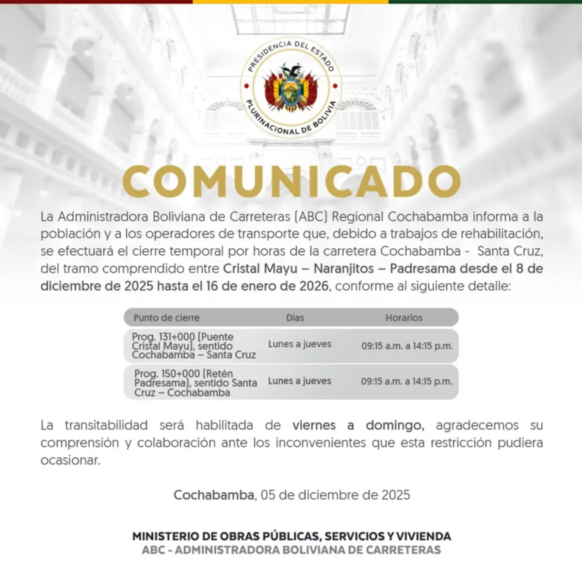 La Administradora Boliviana de Carreteras (ABC) Regional Cochabamba comunica a la población y a los operadores de transporte que, debido a trabajos de rehabilitación, se efectuará el cierre temporal por horas de la carretera que conecta Cochabamba con Santa Cruz.