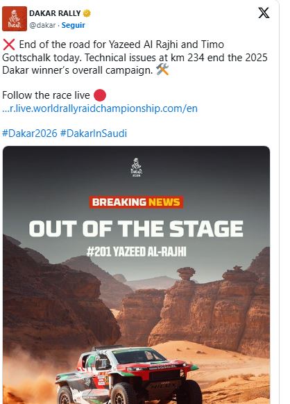 Al-Rajhi se convirtió el año pasado en el primer piloto saudí en ganar la carrera más dura del mundo… y el primer local que conquistaba un Dakar en 47 años de historia. . Para la edición 2026 en la que defendía el título contaba con una unidad del nuevo Toyota GR Hilux DKR, pero los pinchazos han masacrado al prototipo japonés.