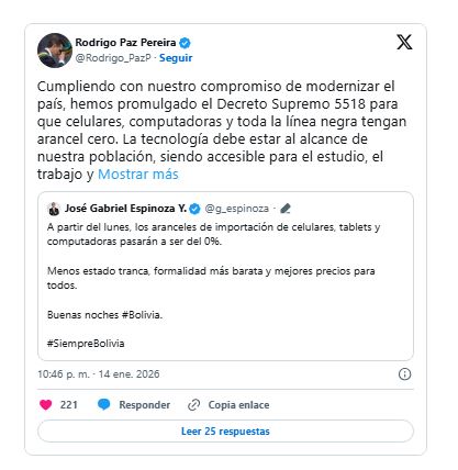 “La tecnología debe estar al alcance de nuestra población, siendo accesible para el estudio, el trabajo y el emprendimiento”, dijo Paz en un mensaje en sus redes sociales sobre esta norma que tendrá vigencia hasta el 31 de diciembre de 2026.