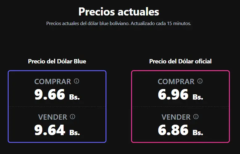 Por otro lado, de acuerdo con el sitio bolivianblue.net, que actualiza la cotización cada 15 minutos, el dólar blue boliviano registra este martes un precio de Bs 9,66 para la compra y Bs 9,64 para la venta, reflejando también una ligera variación en el mercado informal.