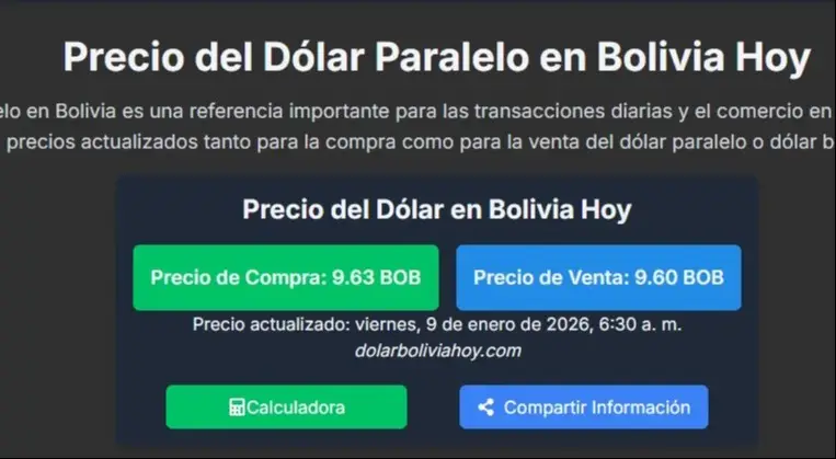 El dólar estadounidense se cotiza este viernes 9 de enero de 2026 en el mercado paralelo a Bs 9,60 para la venta y Bs 9,63 para la compra, según datos del portal especializado dolarboliviahoy.com.