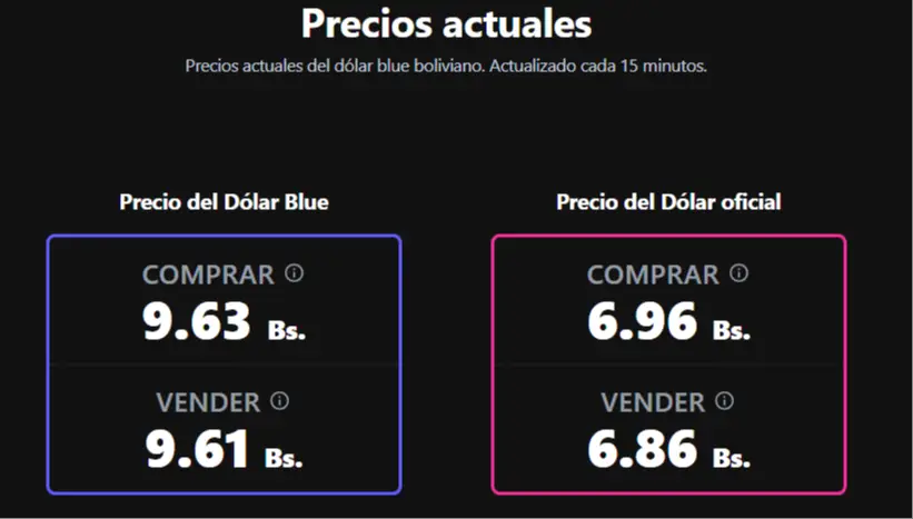 Por su parte, el portal bolivianblue.net, que actualiza la información cada 15 minutos, informó que el dólar blue boliviano se cotiza este viernes en Bs 9,63 para la compra y Bs 9,61 para la venta, mostrando una tendencia similar en el mercado informal.