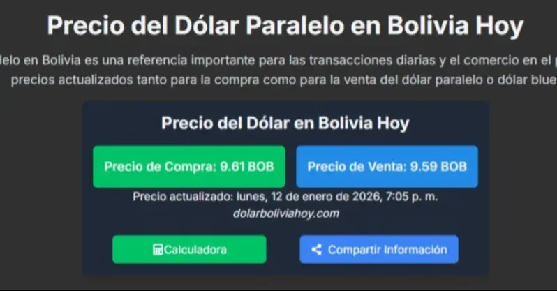 Según datos emitidos la noche de este lunes 12 de enero de 2026, por el portal especializado dolarboliviahoy.com, la divisa estadounidense se cotiza en el mercado paralelo con un precio a la venta de 9.59 (BOB), y un precio de compra de 9.61 (BOB).