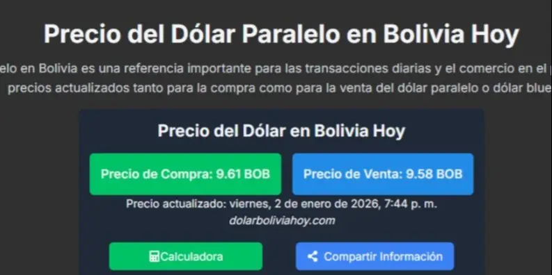Según datos emitidos la noche de este viernes 2 de 2025, por el portal especializado dolarboliviahoy.com, la divisa estadounidense se cotiza en el mercado paralelo con un precio a la venta de 9.58 (BOB), y un precio de compra de 9.61 (BOB).