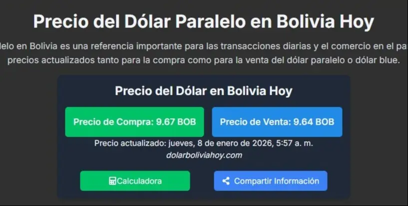 El dólar estadounidense se cotiza este jueves 8 de enero de 2026 en el mercado paralelo a Bs 9,64 para la venta y Bs 9,67 para la compra, de acuerdo con datos del portal especializado dolarboliviahoy.com.