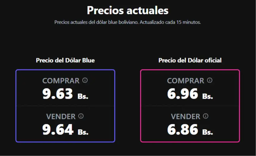 Por su parte, el sitio bolivianblue.net, que actualiza la cotización cada 15 minutos, informó que el dólar blue boliviano se cotiza este jueves en Bs 9,63 para la compra y Bs 9,64 para la venta, mostrando una tendencia similar en el mercado informal.