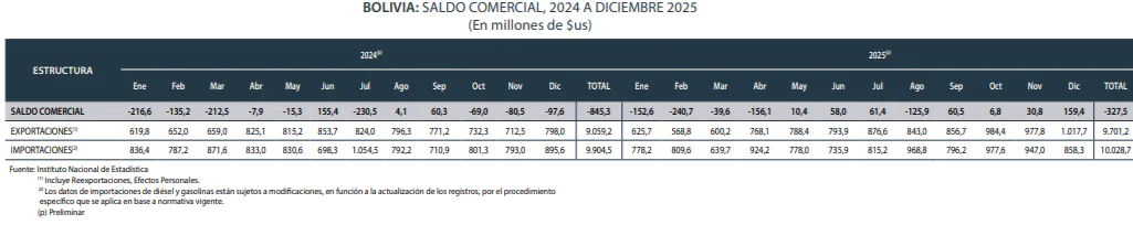 “En diciembre de 2025, el comercio exterior de Bolivia registró un saldo positivo de $us 159,4 millones, como resultado de la diferencia entre exportaciones de $us 1.017,7 millones e importaciones de $us 858,3 millones”, dice el reporte del INE.