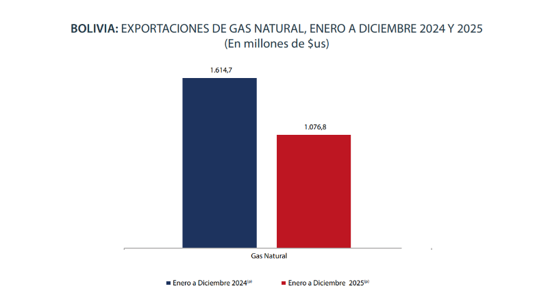 El informe refleja que, en el año 2025, las exportaciones del hidrocarburo alcanzaron los $us 1.076,8 millones, mientras que en el periodo 2024 la cifra fue de $us 1.614,7 millones, es decir, hay una caída en torno al 33%.