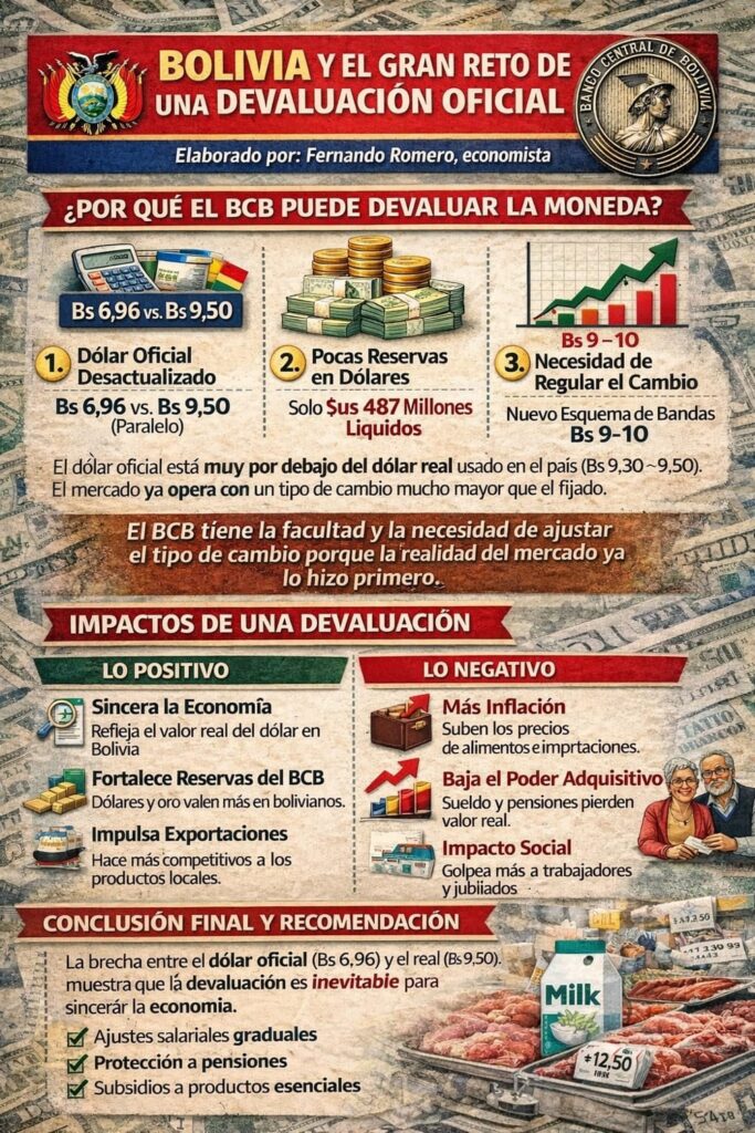 👉 El mercado ya opera con un dólar 35–40% más caro. El BCB ya reconoció implícitamente la devaluación al publicar un “tipo de cambio real”. Formalizarla es coherente con la realidad económica.