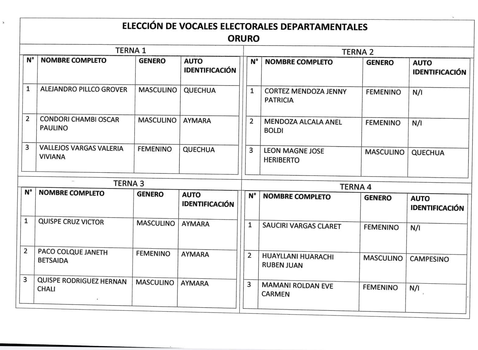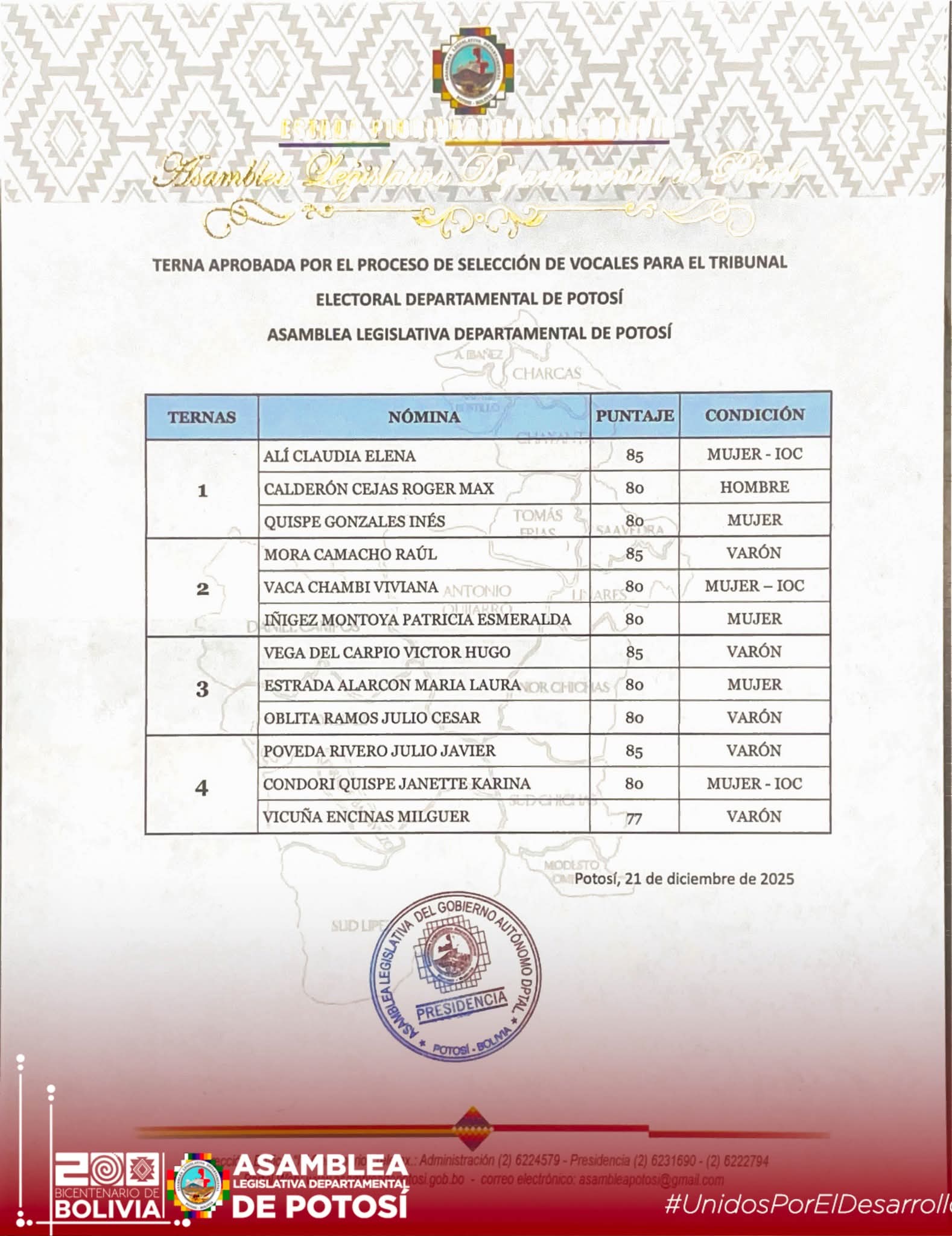 En Oruro, luego de anular el primero proceso de selección, ejecutado en 2025, la Asamblea Legislativa Departamental seleccionó el martes a las cuatro ternas para la designación de los vocales del TED.