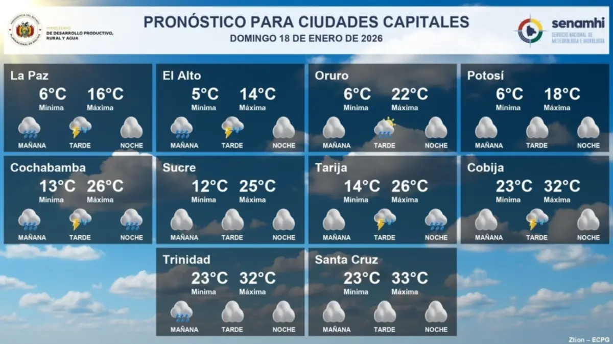 Las principales ciudades capitales de Bolivia registrarán este domingo 18 de enero un clima inestable, con cielos nubosos, lluvias y tormentas eléctricas en varias regiones del país, según informó el Servicio Nacional de Meteorología e Hidrología (Senamhi).
