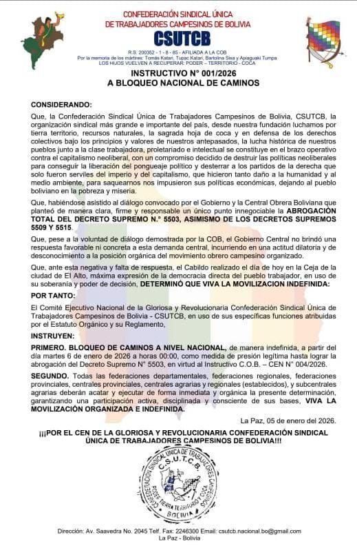 La principal organización campesina del país instruyó un bloqueo indefinido de carreteras desde el 6 de enero, en respaldo a la medida definida por la COB y en demanda de la abrogación total del Decreto Supremo 5503 y normas conexas.