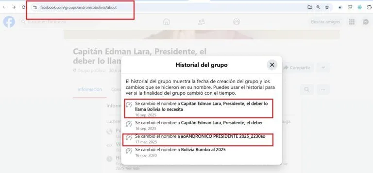 El grupo fue creado el 16 de noviembre de 2020 bajo el nombre “Bolivia Rumbo al 2025”. Años después pasó a llamarse “Andrónico Presidente 2025-2030” y actualmente adoptó el nombre del vicepresidente, aunque su URL aún conserva la referencia a Rodríguez.